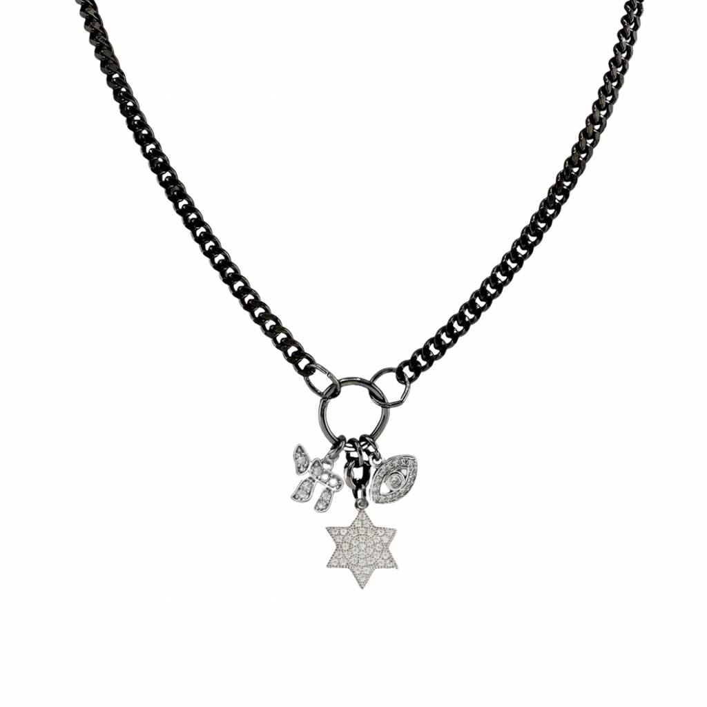 A meaningful necklace featuring the Star of David, Chai, and Evil Eye charms. Measures 16" with lobster clasp closure.