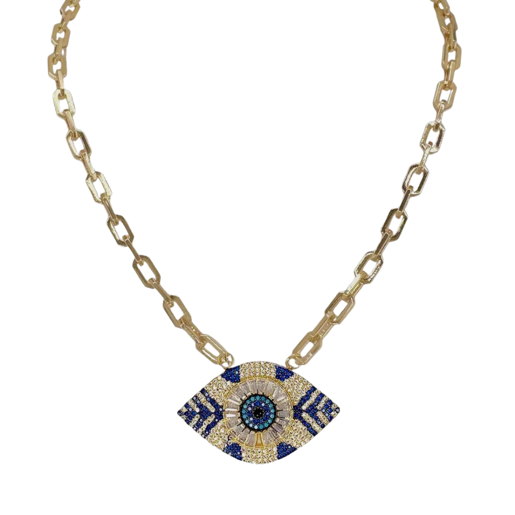 Colorful evil eye necklace on a 16 inch paperclip chain with crystal detailing. Lightweight and stylish for gifting or everyday wear.